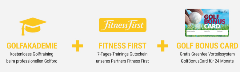 - Wertvolle Zusatzleistungen: Golf-Training an 12 Standorten bundesweit bei top Golf-Pros, inklusive Zugang zum Greenfee-Vorteilsystem GolfBonusCard mit über 250 Partnerclubs weltweit sowie inklusive 7-Tages-Trainings/Wellness-Gutschein für 2 Personen bei unserem Premiumpartner Fitness First!
